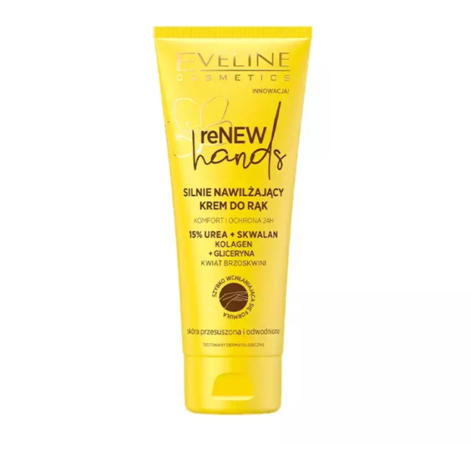 Silnie nawilżający krem do rąk od Eveline polecany jest w szczególności do codziennej pielęgnacji dłoni przesuszonych i odwodnionych. Krem niweluje uczucie przesuszenia oraz zmiękcza i wzmacnia naskórek.