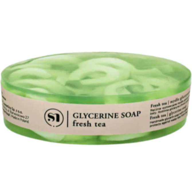 Ręcznie wytwarzane mydło naturalne na bazie gliceryny roślinnej o zapachu zielonej herbaty. Dzięki wysokiej zawartości nawilżającej gliceryny doskonale odżywia i pielęgnuje skórę dłoni.