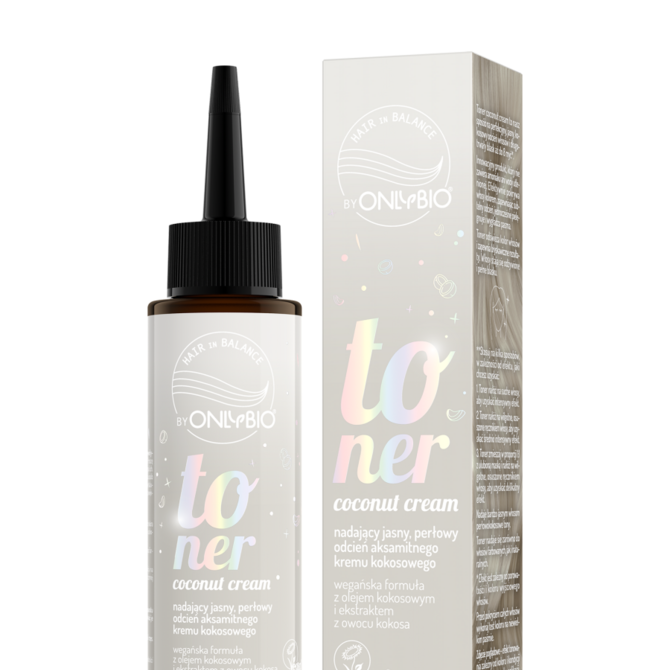 Toner do włosów blond OnlyBio Hair in Balance, który odświeża kolor, nadając włosom jasny, perłowy odcień aksamitnego kremu kokosowego.
