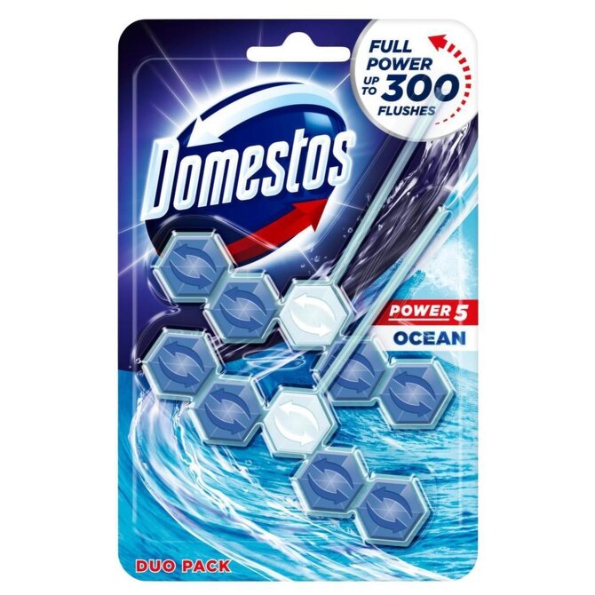 Domestos Power 5 Ocean to wydajna i skuteczna zawieszka do WC, która nie tylko oczyszcza i odświeża muszlę toaletową, ale także zapobiega osadzaniu się kamienia i eliminuje bakterie. Dzięki 5 aktywnym funkcjom, każda spłuczka zapewnia lśniącą czystość.