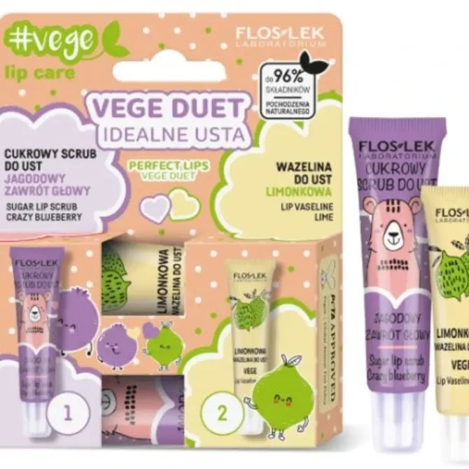 FLOSLEK VEGE DUET IDEALNE USTA Cukrowy Scrub Do Ust Jagodowy Zawrót Głowy 14 g + Wazelina Do Ust Limonkowa 10 g