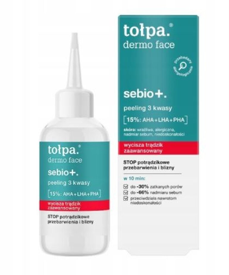 Tołpa Dermo Face Sebio+ peeling 3 acids 50 ml thanks to its active formula helps unclog pores and reduces the risk of discoloration and acne scars. Recommended for skin with imperfections, oily, sensitive and allergic.